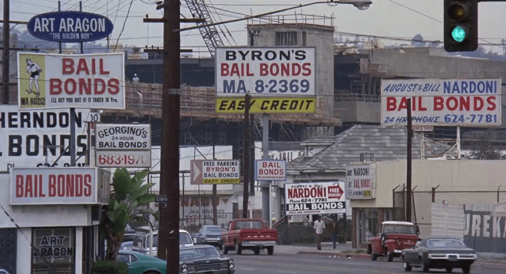 Car la caractéristique la plus évidente du Los Angeles de « Truck Turner » est justement son « look » uniforme et interchangeable où la publicité et la signalétique cadrent l’espace en permanence.