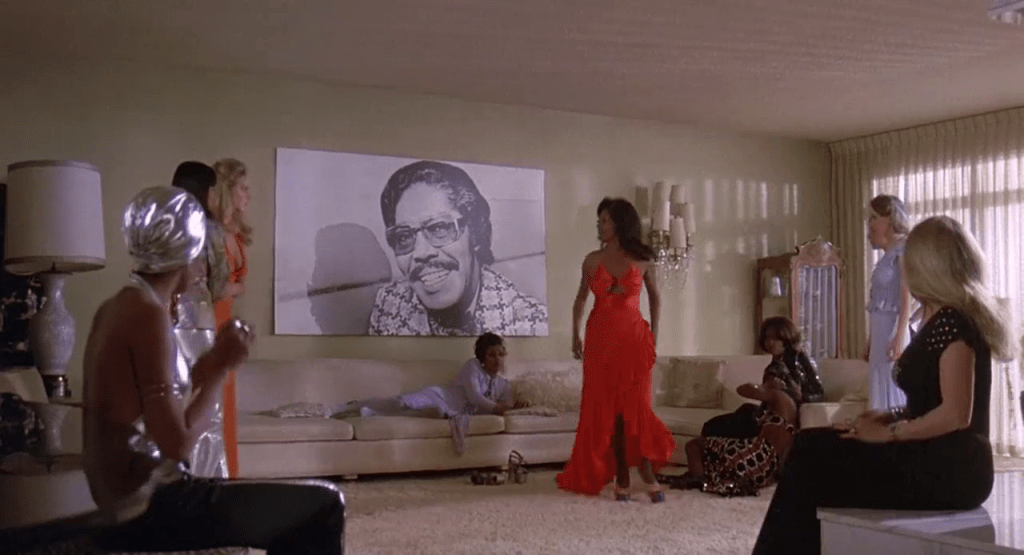 Un soupçon d’individualisme extravagant se dégage néanmoins de la villa super-moderne et super-kitsche du super-méchant Harvard Blue (le toujours suave Yaphet Kotto, ci-dessous en vison blanc) qui combine un socle en béton imitant une grotte préhistorique, avec un mur en rideau de verre, encadrée par une végétalisation débordante.