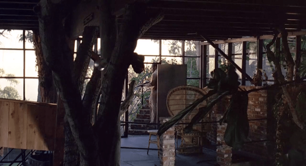 La maison semble traversée par les arbres qui l’entourent et est décorée avec le fauteuil de rotin tout droit sorti d’ « Emmanuelle ». Une vraie « demeure de salaud » !