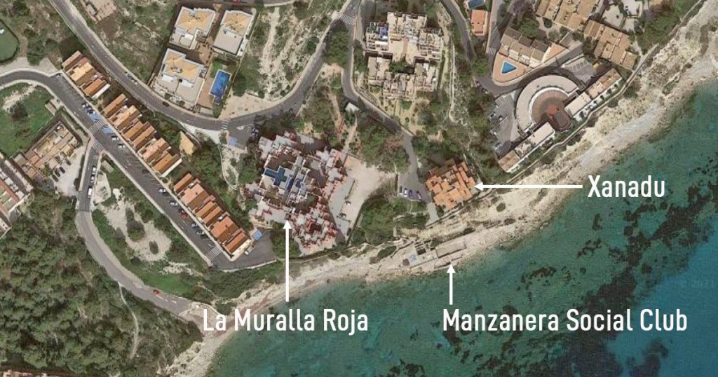 Les quelques vues qui suggèrent l’intérieur de la maison ont été tournées dans une autre villa de Ricardo Bofill, construite en 1973, à deux pas de la maison « Xanadu » : « La Muralla Roja ».