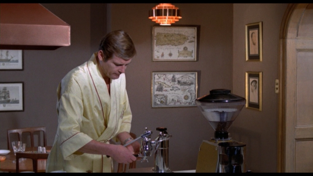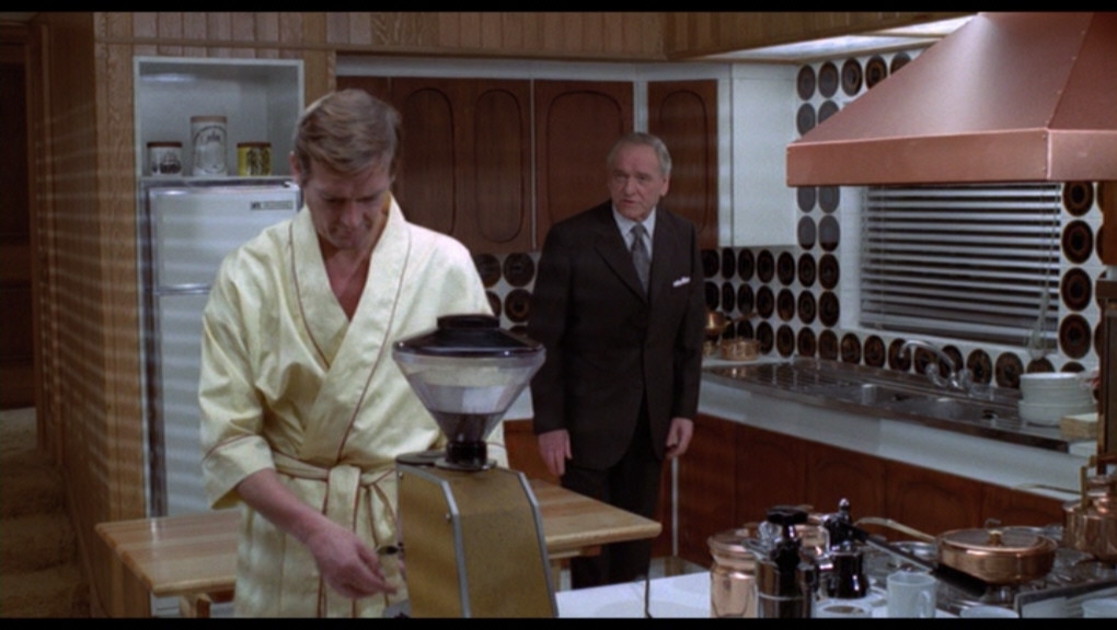 Il faut attendre 11 ans et un nouveau James Bond (Roger Moore) pour apercevoir une deuxième fois l’appartement de notre agent secret. Aussi ringard que le premier, le décor s’efforce néanmoins d’introduire (avec peu de succès) quelques bribes de design (le revêtement Vénilia au motif circulaire au-dessus de l’évier, la lampe en bandeau de cuivre). Mais il possède cependant une bonne « machine à expresso ».