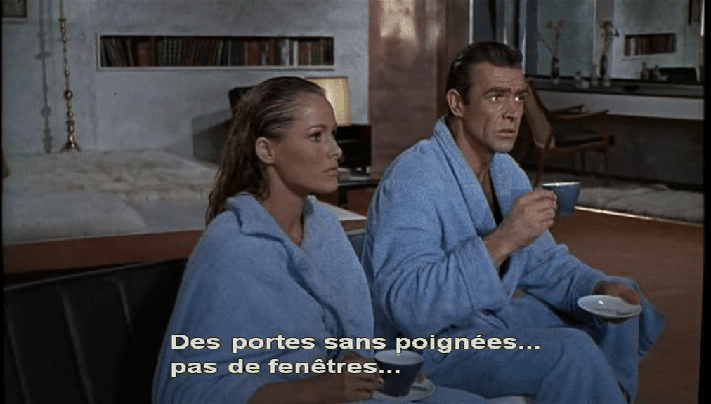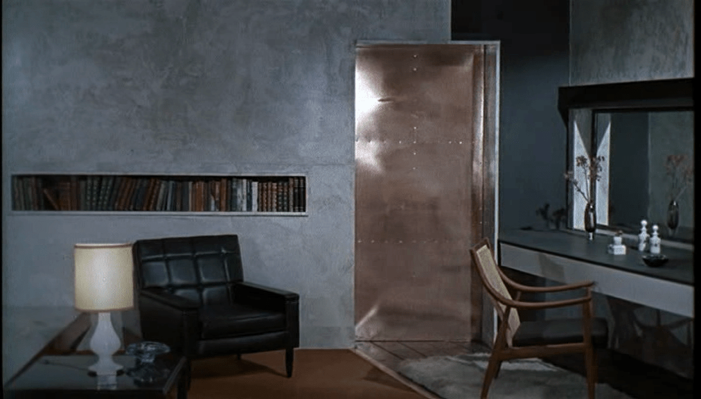 La chambre où 007 (Sean Connery) et Holly Ryder (Ursula Andres) sont prisonniers après avoir été capturés par le mystérieux Dr. No est d’un tout autre design : portes métalliques coulissantes, parois en pierre épurée, mobilier moderne (le moderne de 1962), avec une fente longitudinale dans le mur en guise de bibliothèque.