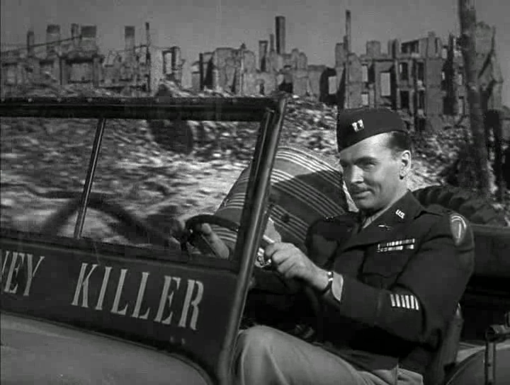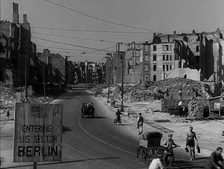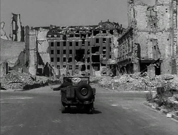 Le trajet du capitaine John Pringle (John Lund) en Jeep est un autre exemple de l’usage des trois procédés de tournage : scènes tournées sur place à Berlin, scènes tournées en transparence en studio à Hollywood et scènes tournées des grands décors artificiels extérieur à Hollywood :
