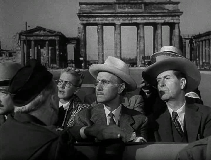 Des nombreuses scènes sont alors filmées par transparence avec les acteurs en studio devant un écran où défilent les images glanées à Berlin : Jean Arthur descend en voiture l’allée « Unter den Linden » avec la caractéristique « Siegessäule » en arrière-plan. Elle note les comportements moraux des jeunes GI’s stationnés à Berlin …