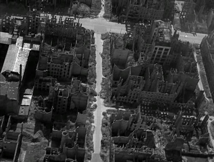Si les séquences tournées en transparence (à gauche) affaiblissent quelque peu la véracité du contenu, le film reste un document poignant sur la destruction de la ville et sur la situation des survivants dans l’immédiate après-guerre en Allemagne.