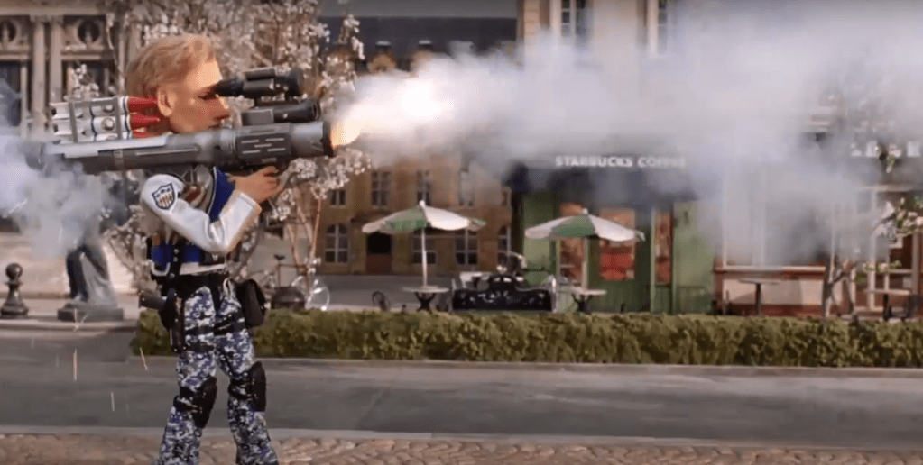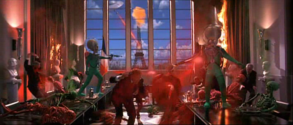 Puis en 1996, d’autres visiteurs de l’espace, les affreux hommes verts de Tim Burton saccagent « ce squelette de beffroi » (Paul Verlaine) avec un certain plaisir dans « Mars Attacks », un pastiche des films de science-fiction des années 50/60.
