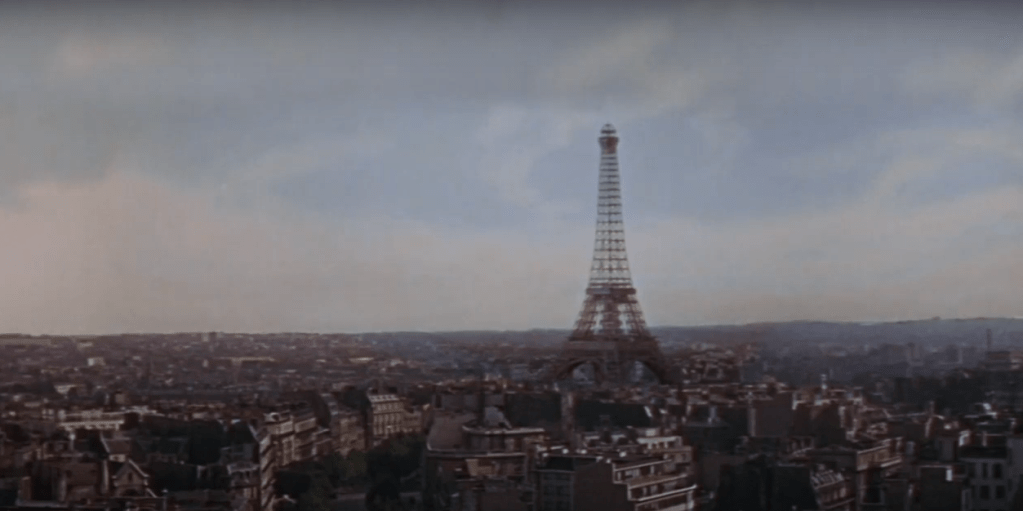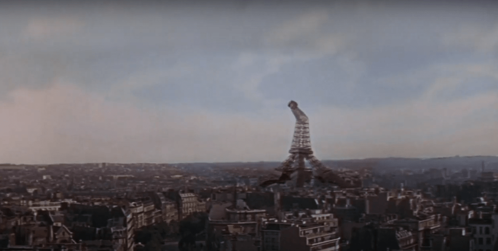 Des méchants extraterrestres de « La Guerre des mondes » (la version de 1953) s’attaquent dans leurs soucoupes volantes, au monument le plus célèbre de la ville de Paris pour la réduire en poussière.