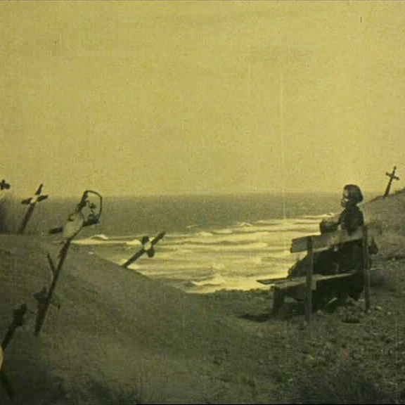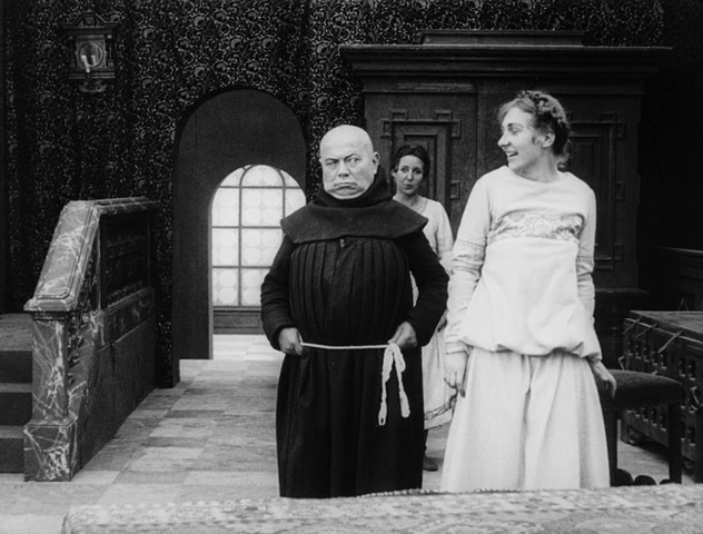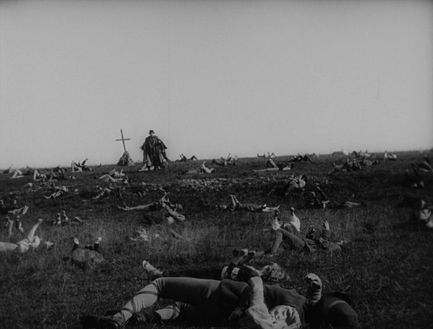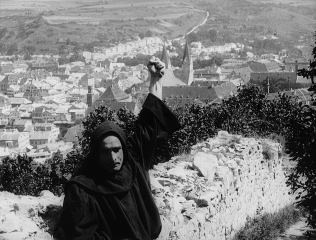 Ce dernier est magnifiquement mis en scène par Rippert. Sur l’image çi-dessus, la maîtrise de la profondeur de champ est évidente avec le parallèle entre les deux personnages du premier plan et les deux arcs sombres en arrière-plan qui suggèrent un vide prêt à aspirer les acteurs, accentué par la présence de la Mort au centre (l’inquiétante Julietta Brandt).