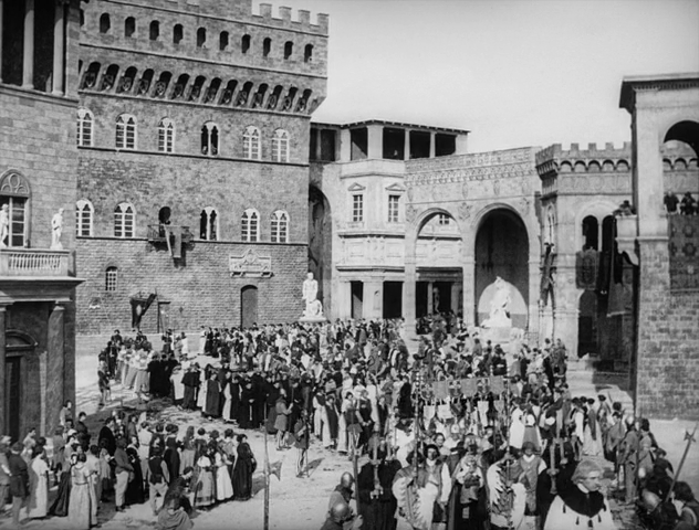 La place du marché de Florence, avec le Palazzo Vecchio et la Loggia dei Lanzi, est reconstruite à grand frais et grandeur nature dans les ateliers de la UFA à Berlin par l’architecte Franz Jaffé, sous la direction de Hermann Warm et Walter Reimann.