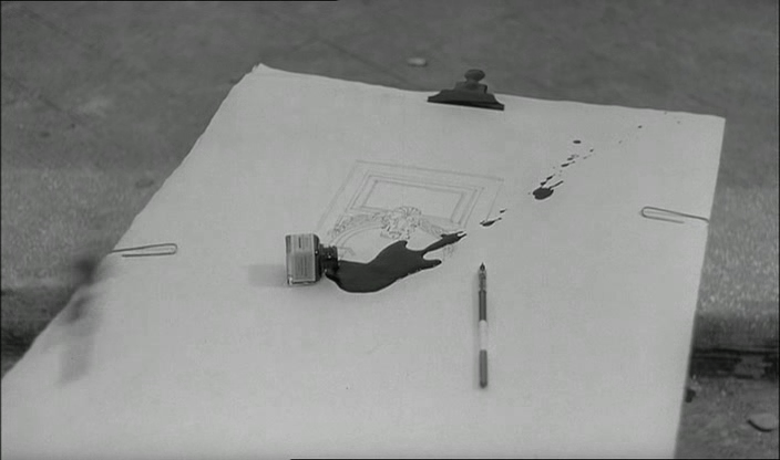 Envieux du beau dessin d’un jeune architecte, il le détruit en renversant délibérément de l’encre sur le croquis en cours d’execution. Expression (un peu appuyée) du désespoir et de la jalousie d’un fanfaron passé à côté de sa vocation.