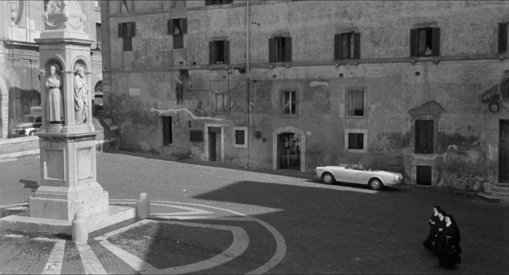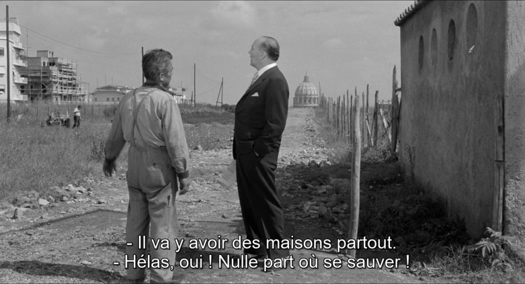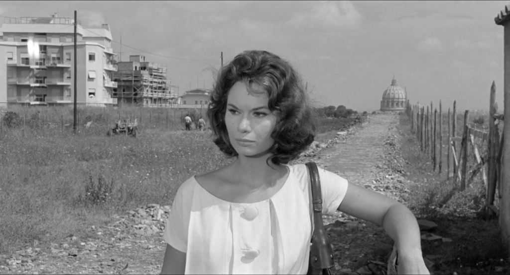 Antonioni cadre Léa Massari entre les chantiers des nouveaux logements qui grignotent la campagne et un sentier en direction de la coupole de la basilique Saint-Pierre, un des monuments historiques de la ville. Il met ainsi le futur et le passé de la périphérie de Rome dans un même plan.