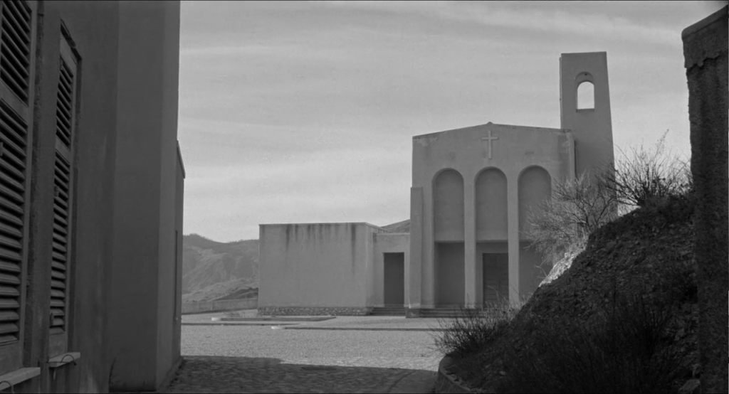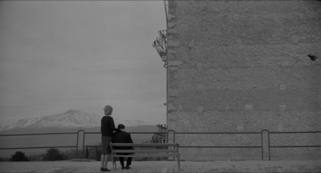 La dernière image montre Sandro, l’architecte effondré, et Claudia, la muse réconfortante, sur un banc. Devant eux, le paysage est divisé : la plaine avec au fond l’emblématique silhouette de l’ Etna à gauche, et à droite l’immense mur aveugle de l’église San Domenico.