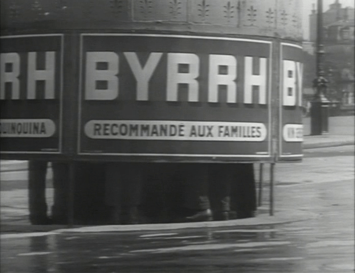 Parmi les vignettes des monuments indispensables, Hitchcock fait preuve de son humour pince-sans-rire en insérant également la vue d’une pissotière avec une affiche pour le quinquina Byrrh, recommandé aux familles.