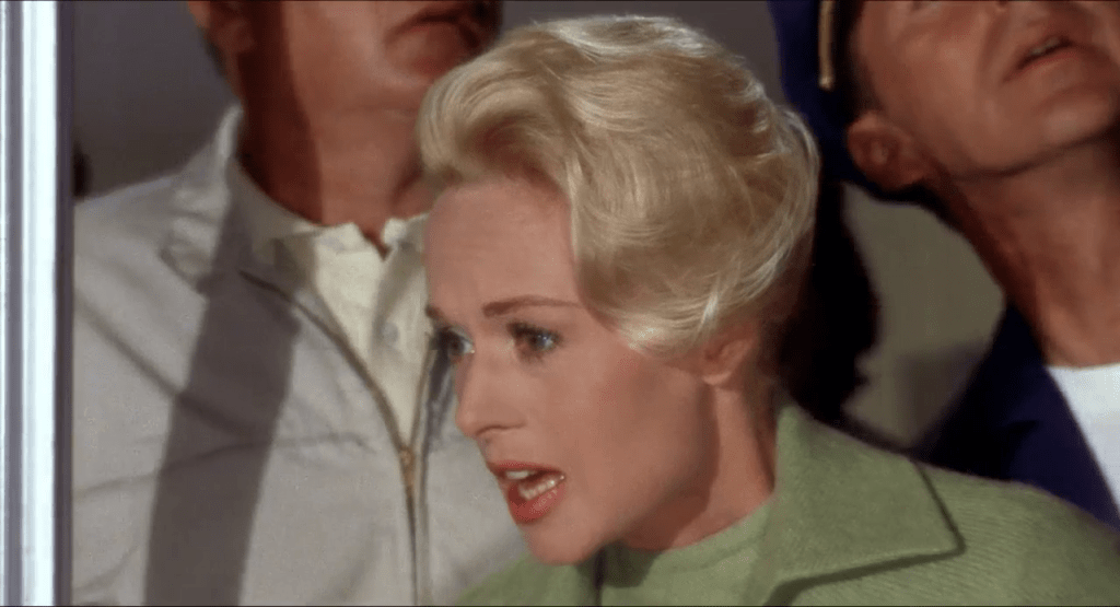Ce procédé à la manière d’un « ciné-roman » rappelle la réaction affolée de Tippi Hedren face à l’attaque des oiseaux d’une station-service dans le film du même nom, tourné 32 ans plus tard.