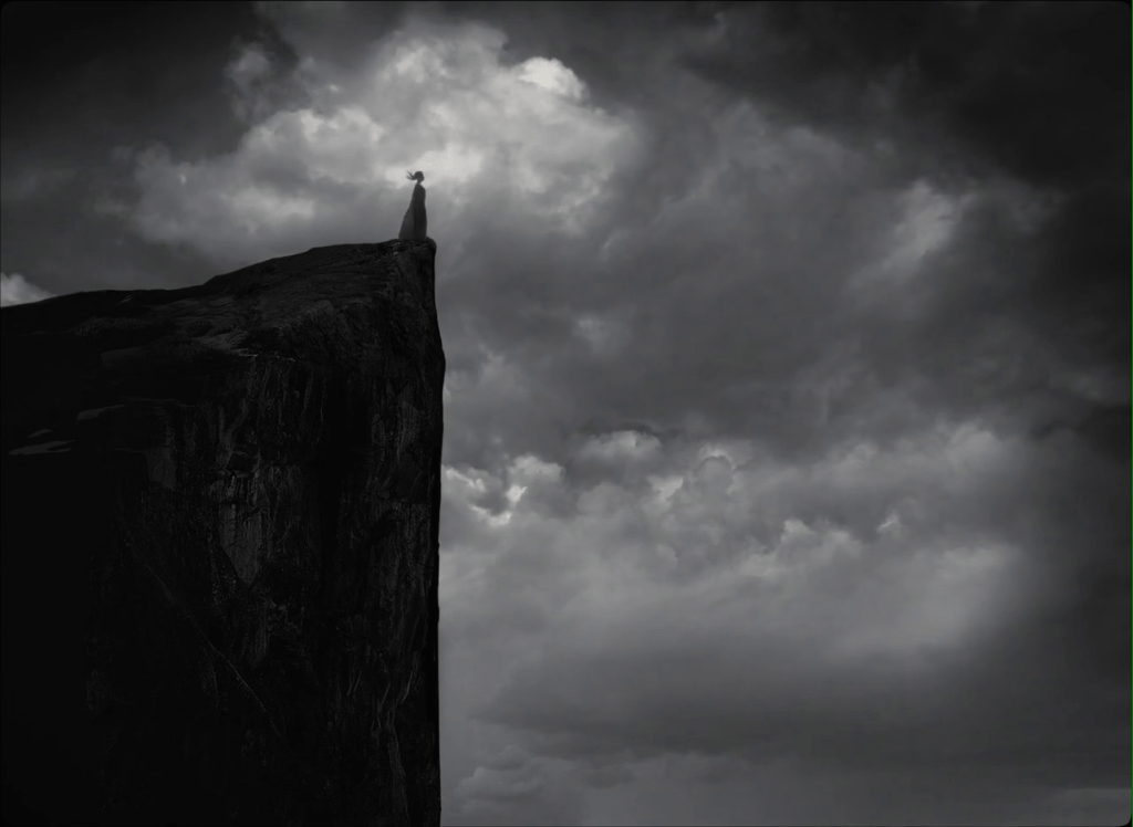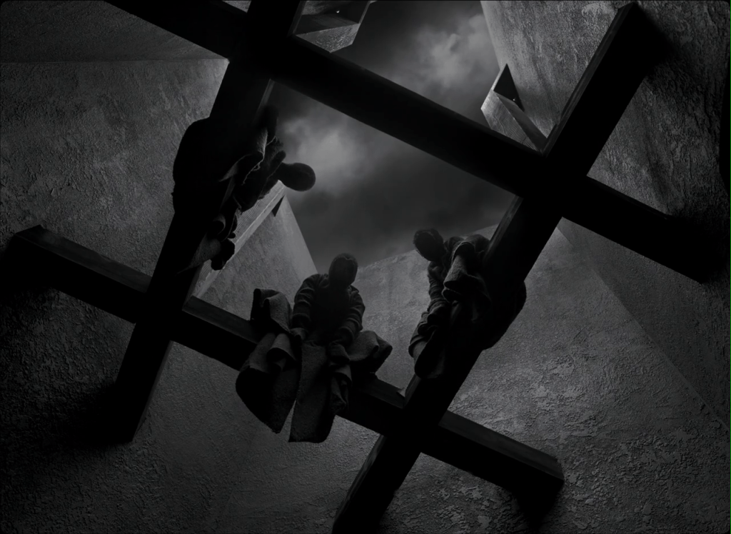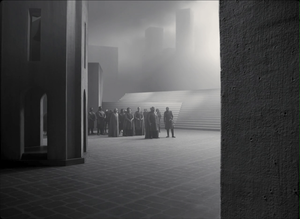 Malgré la dédicace au peuple allemand qui précède les « Nibelungen », Lang donne une universalité au récit par l’abstraction totale de l’ensemble des éléments architecturaux et spatiaux (ci-dessus )à gauche). Une approche que Joel Coen applique dans son « Macbeth » (ci-dessus à droite) avec la même intensité.
