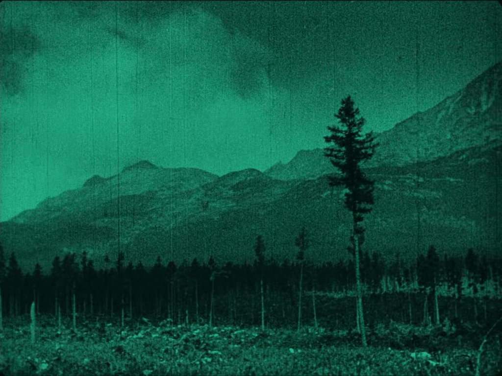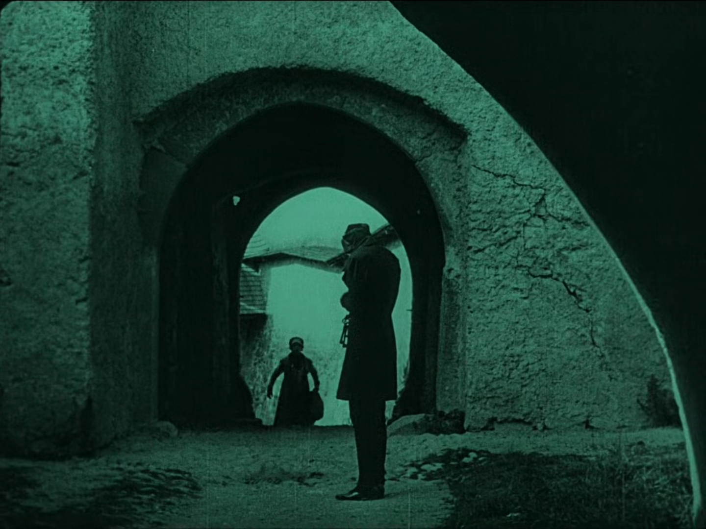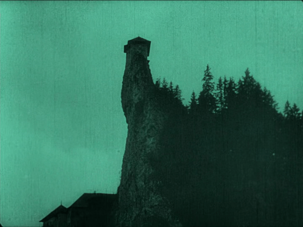 … qui contrastent avec l’inquiétante campagne qui entoure le château du comte Orlock, filmé dans le massif des Tatras entre la Slovaquie et la Pologne. Le film est teinté de couleurs unies, soit pour distinguer des moments de la journée (sépia ou rose pour le jour ; vert ou bleuté pour la nuit), ou comme ci-dessus pour montrer les ambiances (sépia pour illustrer l’insouciance et le bien-être ; vert-froid pour l’angoisse, l’appréhension). Pour Murnau, « les paysages sont des états de l’âme ».