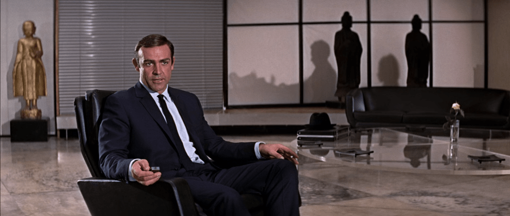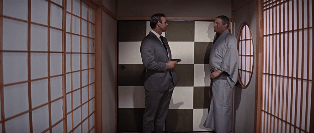 007 se rend d’abord chez son collègue Dikko Henderson (l’onctueux Charles Gray) pour commencer son enquête. Ken Adam porte à son paroxysme l’intérieur japonais classique (déjà très épuré) – sans doute inspiré par les délires décoratifs vus dans le film de Joseph Losey, « Modesty Blaise ».