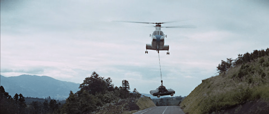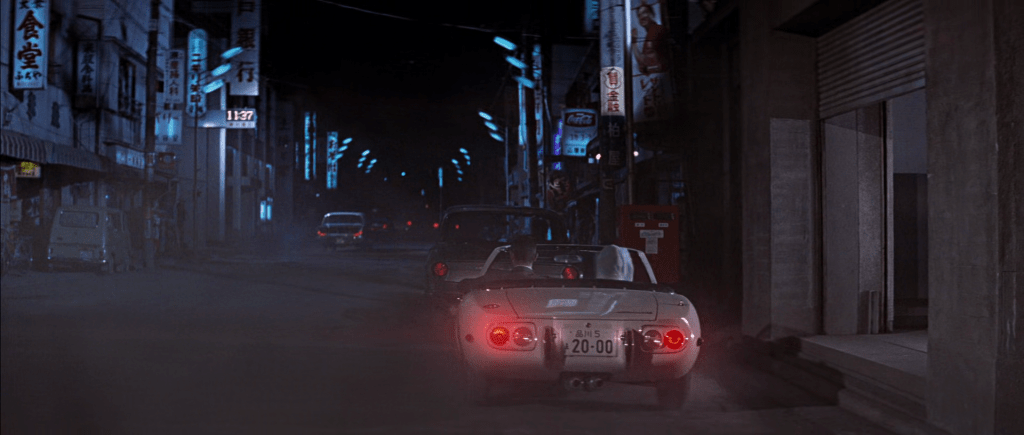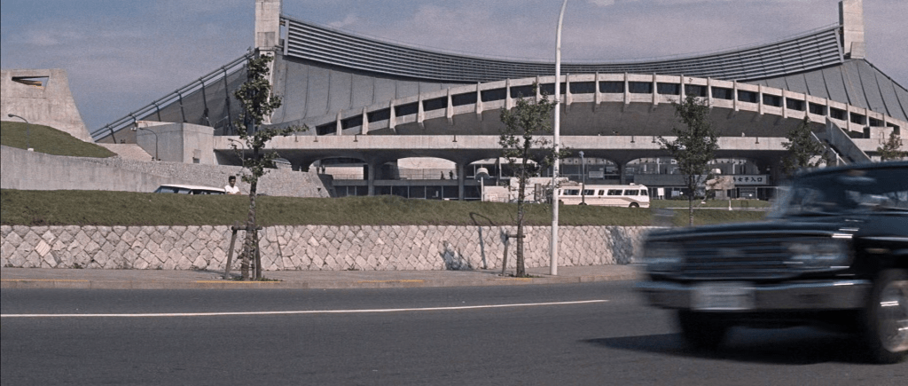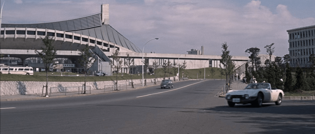 Une course-poursuite en Toyota GT 2000 décapotable permet néanmoins de montrer au passage le stade national de Yoyogi, construit en 1964 par Kenzo Tange, le plus connu alors des architectes japonais.