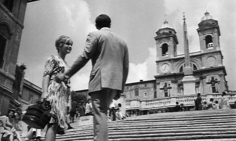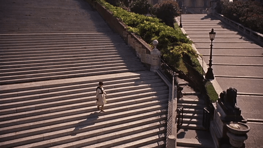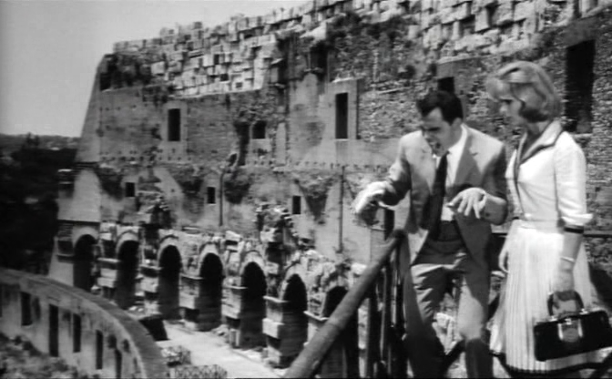 Contournons ensuite le bâtiment par la droite, pour suivre Suzanne Pleshette dans « Amours à l’italienne »8, qui descend les escaliers pour en remonter d’autres jusqu’à …
