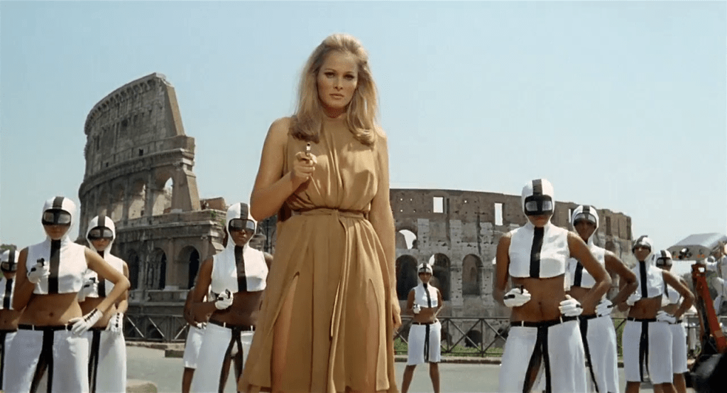 On retient surtout l’apparition d’Ursula Andres au pied du Colisée, très déterminée à éliminer sa « Dixième Victime »10, avec une mise à mort très pop, digne des années soixante.