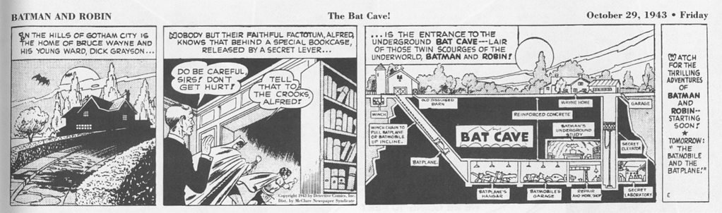 Bob Kane, présent sur le tournage, reprend ensuite cette idée avec l’aide de Bill Finger (qui suggère un dessin évoquant une coupe technique) : la batcave fait son entrée dans l’univers dessiné du super-héros, en octobre 1943.
