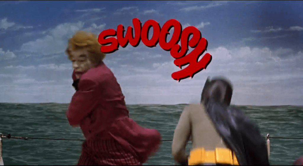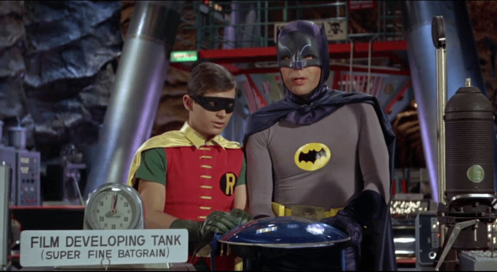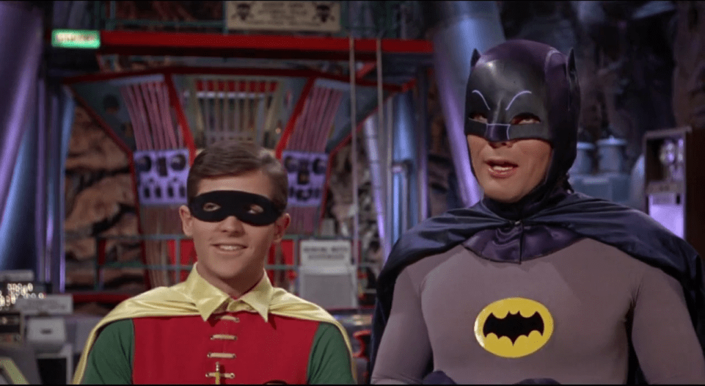 Dans les années 60, Batman refait surface à la télé et au cinéma sous forme d’une série pop, colorée et déjantée qui rend le justicier masqué volontairement risible. Le sérieux de la bande dessinée est évacué par des méchants plus ridicules que menaçants, face au couple Batman (Adam West) et Robin (Burt Ward), dont le sérieux exagéré prête à sourire.