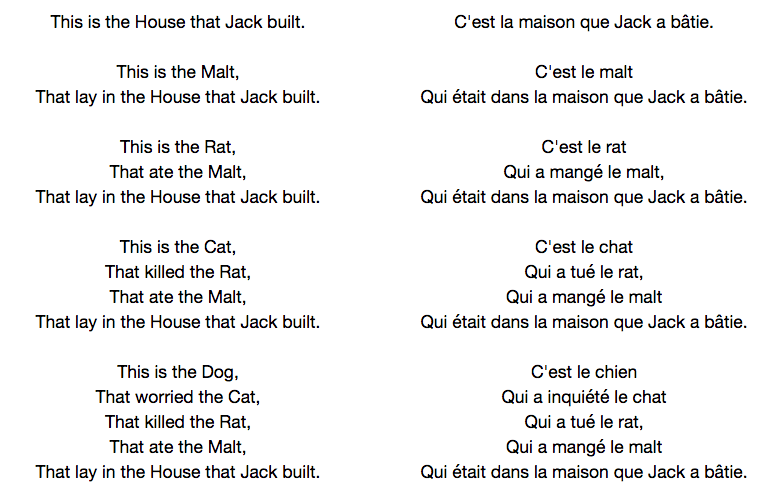 « The house that Jack built » est une chanson traditionnelle anglaise basée sur le principe de l’anadiplose, puisque c’est une chanson « à accumulation » ou « à récapitulation ». Chaque couplet ajoute une phrase et répète l’ensemble des phrases précédentes :