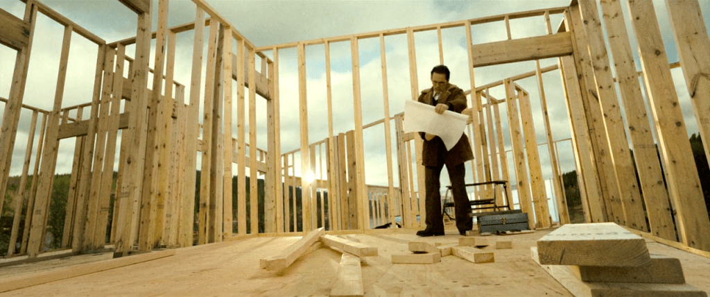 Et la maison de Jack dans tout ça ? Le site où elle est située est magnifique et mériterait en effet un chef-d’œuvre d’architecture. Mais les maquettes et dessins de Jack affichent déjà le manque d’inspiration de son créateur. La dernière tentative de construction, une variante de la maison domino de Le Corbusier en ossature bois, fait penser à un mirador et établit au moins un lien avec l’engouement de Jack pour la chasse …