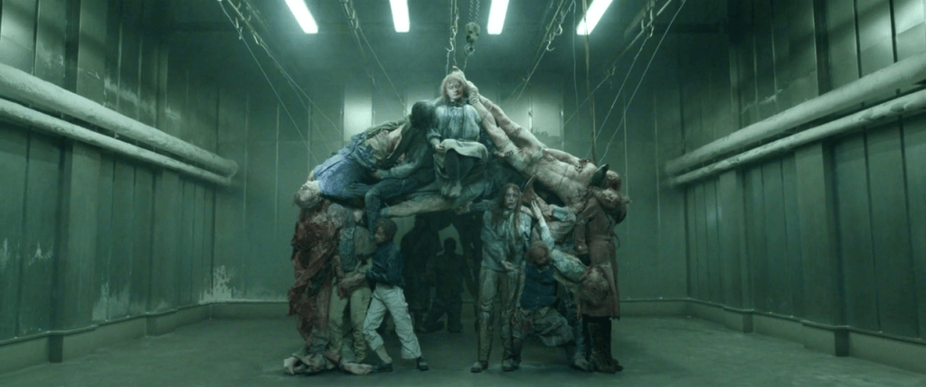 Une maison construite avec les cadavres de ses victimes ! Qu’elle ne tienne pas debout (sans sa coque réfrigérée et sans les innombrables câbles et autres supports qui assurent sa stabilité) n’est pas la question, puisque Jack est désormais au-delà de ces banalités fonctionnelles.