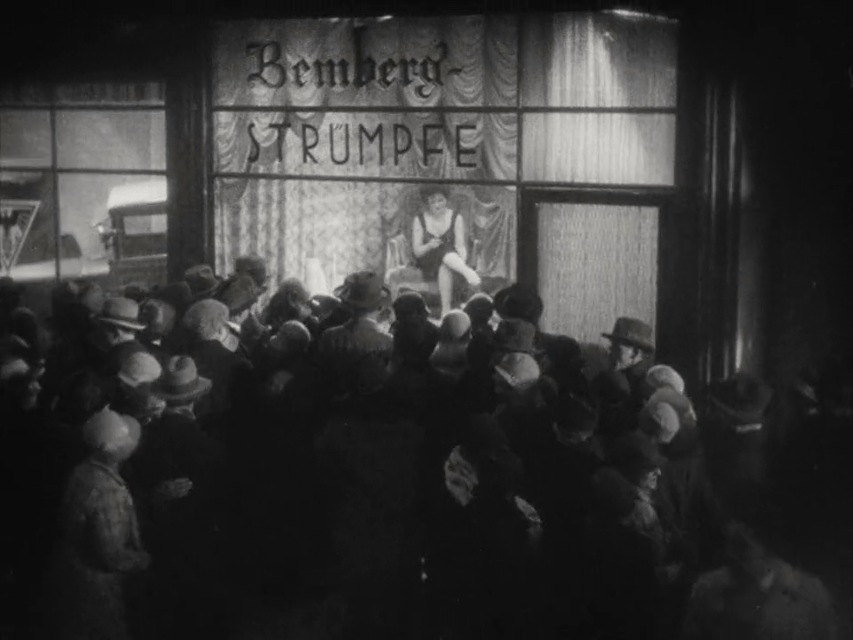 En face du jeune agent de la circulation, la boutique Bemberg, spécialisée dans les bas, attire le chaland avec une vendeuse qui expose ses jolies jambes, ce qui est occasion pour une bande de pickpockets d’alléger de leurs bourses quelques badauds – petit rappel au spectateur que la rue est dangereuse.