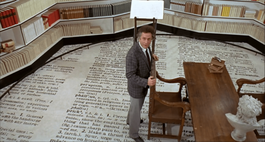Dans une recherche de cohérence absolue, le sol est tapissé d’extraits du dictionnaire (mais attention, uniquement des mots se référant au sexe, qui suggèrent que le châtelain à des centres d’intérêt bien précis) …