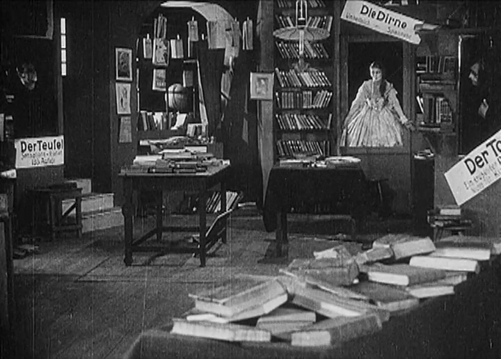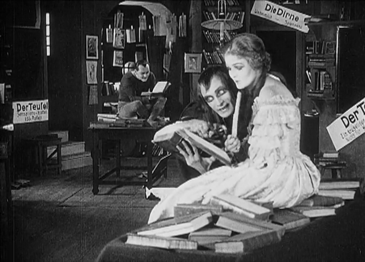 Entourés d’étagères remplies de livres, trois grands tableaux, représentant le diable (le malicieux Reinhold Schünzel), une prostituée (la scandaleuse Anita Berber) et la mort (l’inquiétant Conrad Veidt), prennent vie.