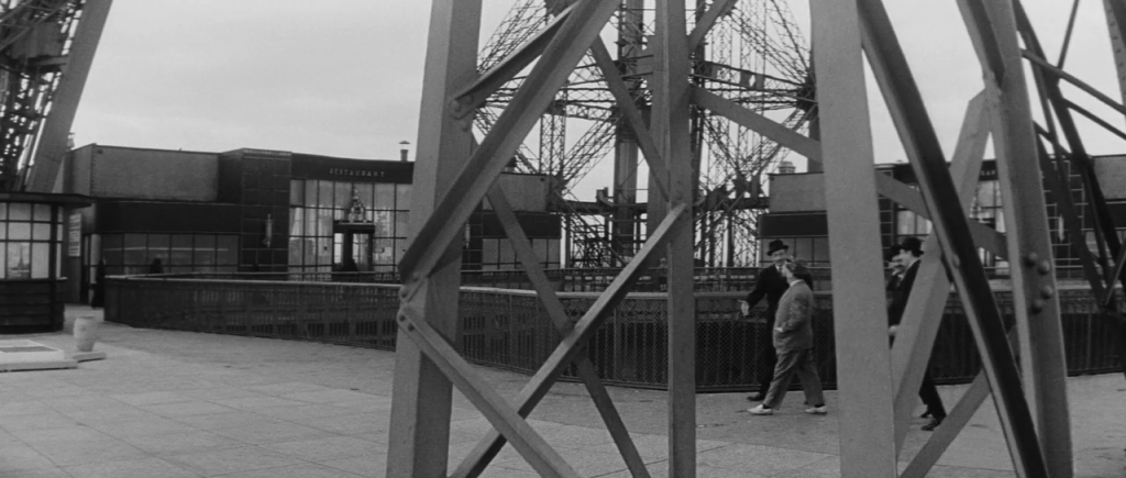 … et des négociations dans des bureaux spécialement aménagés pour embobiner Humlaupt et faire ainsi monter le prix. Avec, au centre, une maquette de la tour telle qu’elle a été prévue à l’origine, avec deux grandes coursives permettant aux visiteurs de profiter de la vue. Ces terrasses supplémentaires ont été abandonnées lors de la construction. Et à gauche Catherine Deneuve (enceinte de son fils Christian Vadim) en potiche qui tricote. (L’actrice déjà célèbre est bien mise en avant sur l’affiche, mais Chabrol ne sait visiblement pas quoi faire d’elle).