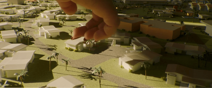 Il s’avère plutôt que la source du problème trouve son origine dans le « Victory project » pour lequel travaillent les hommes de la commune du même nom. Si chaque maison est identique, celle du patron n’est pas seulement originale et plus grande, elle tient aussi la position centrale à la manière des cités ouvrières construites dans l’esprit paternaliste du XIXe siècle.