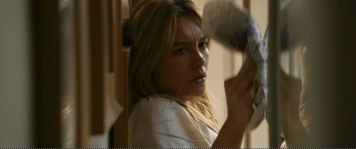 Alice Chambers (Florence Pugh, excellente) s’accommode, comme les autres épouses, des tâches quotidiennes avec la même dévotion que la jeune protagoniste Hunter dans « Swallow » – autre film ou la maison devient « cage dorée » et qui questionne l’importance de la représentativité du « chez-soi » et de la solitude de la femme au foyer.