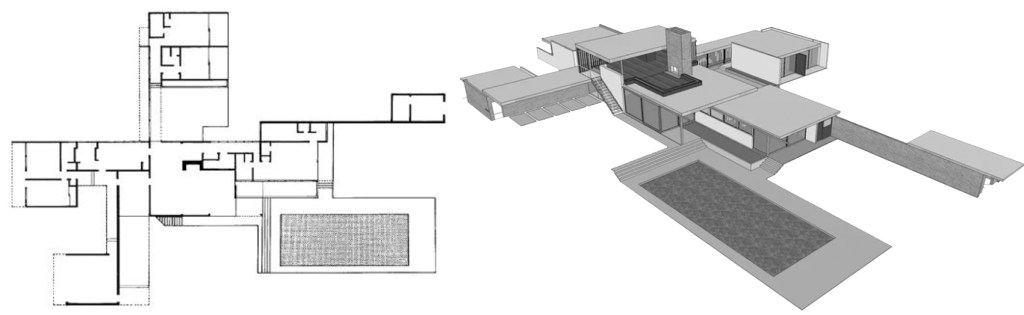 Dix ans auparavant, les Kaufman avaient déjà fait construire une des villas les plus célèbres de l’architecture moderne : « Falling Water » de Frank Lloyd Wright (et qui est une source d’inspiration pour l’architecture du « Rebelle« ). Richard Neutra, ancien employé de Wright, se détourne des doctrines de son maître et oriente le look de la nouvelle villa vers le style des « Case Study Houses », une série de maisons californiennes modernes en structure métallique, initiée par John Entenza entre 1945 et 1966.