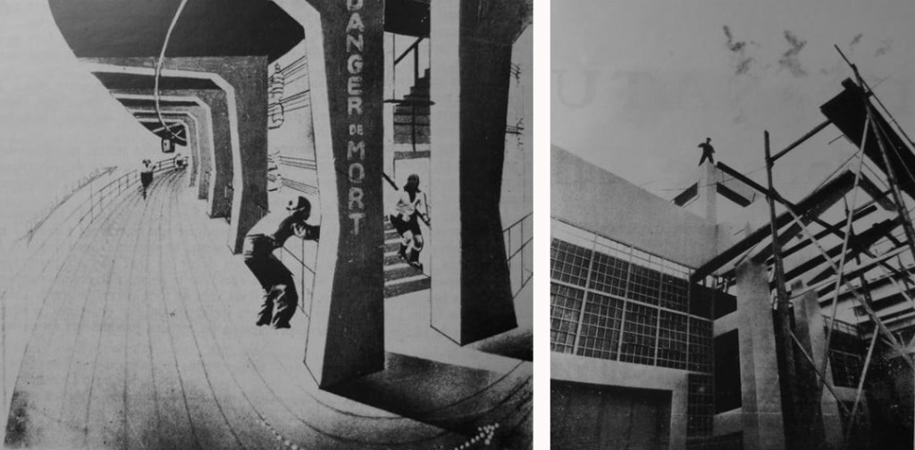 L’influence de Robert Mallet-Stevens (architecte et décorateur de cinéma) – avec lequel Meerson collabore également sur des films de Marcel L’Herbier – est également palpable dans son design (esquisse préliminaire de Meerson à gauche). Pour diminuer les coûts, le décorateur utilise habillement les hangars de production existants à Paris de la Tobis (entreprise cinématographique allemande créée en 1927 à Berlin), en les déguisant ingénieusement (image à droite).