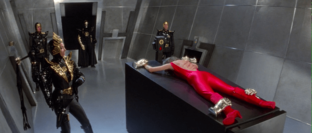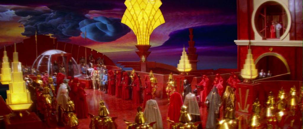 … des teintes plus chaudes et dorées pour les chambres privées de la princesse Aura (Ornella Muti, à droite) – ici en conflit avec Dale Arden (Melany Anderson), la bien-aimée de Flash Gordon, …