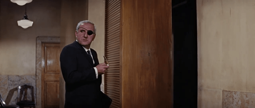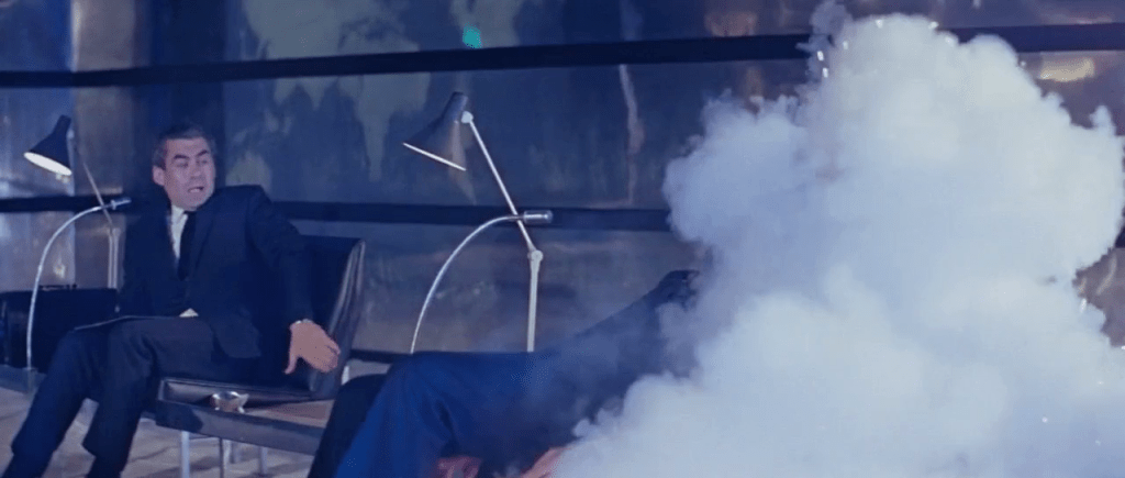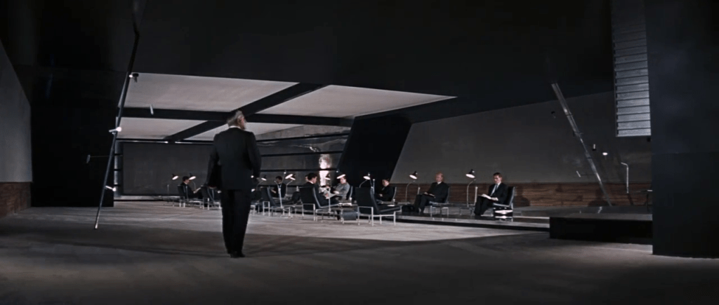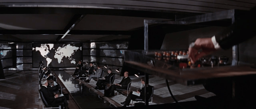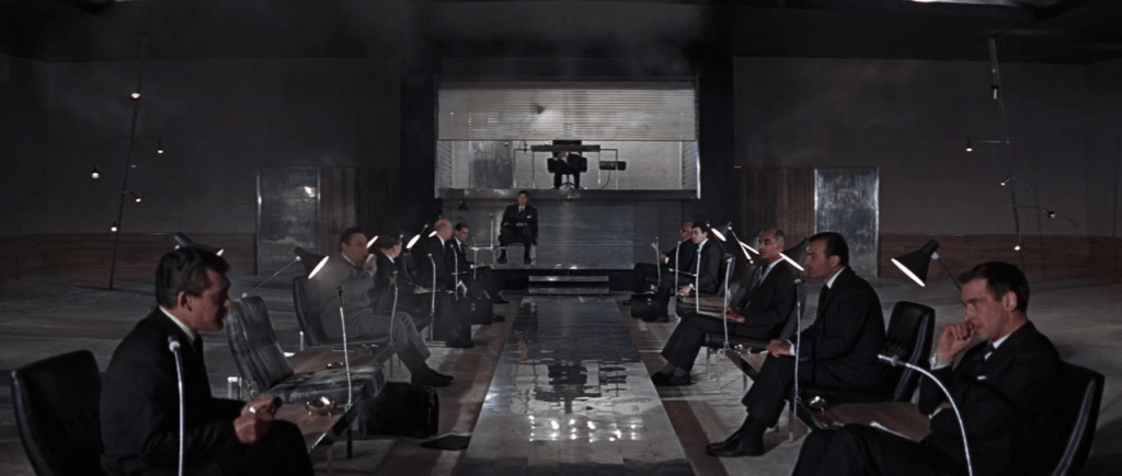 Ernst Stavro Blofeld, son mystérieux chef, trône sur une estrade surélevée, le visage dissimulé derrière une jalousie métallique, tandis que ses complices se font face autour d’une très longue table en métal brillante. Une immense carte du monde à l’autre bout de la pièce affiche les ambitions du SPECTRE.