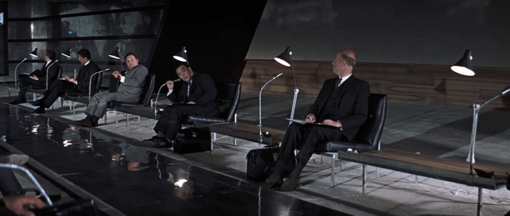 Chez notre agent secret préféré, James Bond 007, même un lieu de travail aussi anodin qu’une salle de réunion est marqué stylistiquement pour ancrer l’action dans un univers malfaisant :