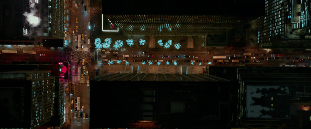 Pourtant, la colorimétrie très contrastée et la prégnance des enseignes dans le deuxième plan évoquent plutôt l’ambiance du Los Angeles futuriste de « Blade Runner ».