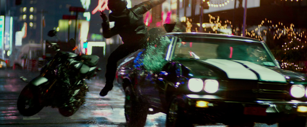 Au moment où Buster Keaton est catapulté de sa moto, traverse une fenêtre et atterrit à l’intérieur d’une maison, un motard tombé dans la rue récupère son engin et continue sa fuite, poursuivi par John Wick dans une Chevrolet Chevelle 1970.