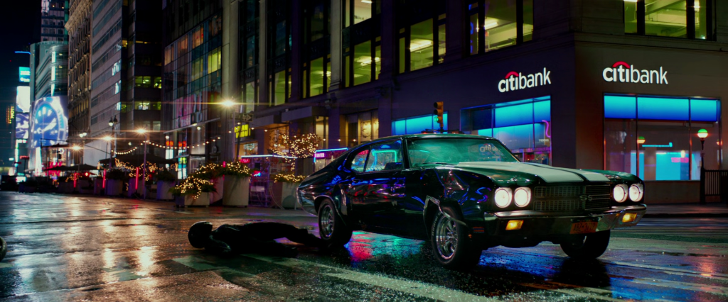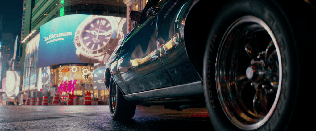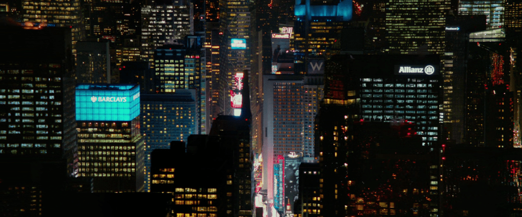 La ville devient à la fois terrain de jeu contemporain et décor stylisé (l’artère important de Broadway est étrangement vide – un peu comme dans un jeu vidéo) que Stahleski recompose à sa guise : le coin de rue avec le film projeté au-dessus d’un magasin de la chaine Victoria’s Secret, qui baigne la rue dans une lumière magenta artificielle, a été tourné dans la rue Sainte- Catherine à Montréal (à 600 km de distance !) et inséré dans les autres parties, tournées à New York.