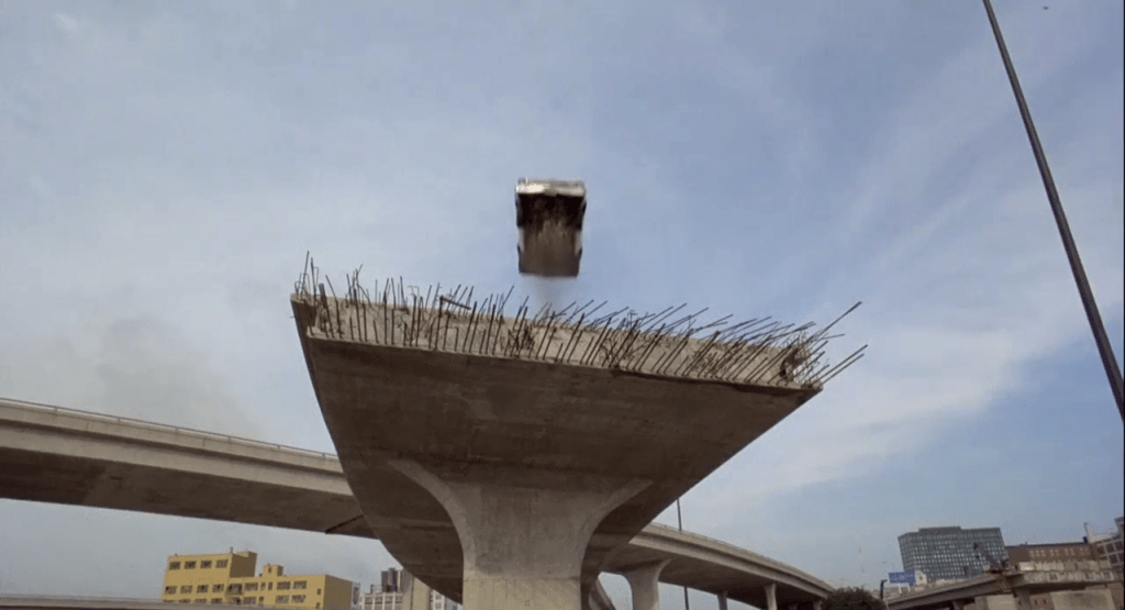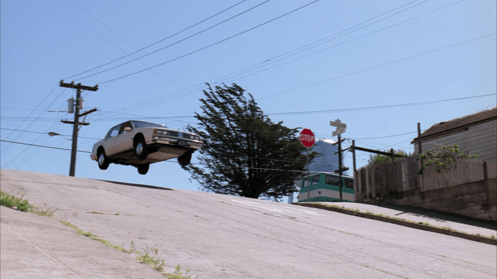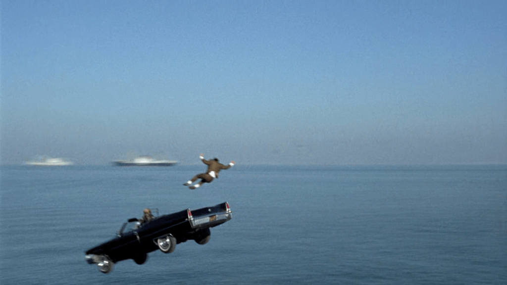 John Landis récupère l’idée en 1980, pour son film BLUES BROTHERS (qui se passe à Chicago). Cette fois-ci, la voiture des malfaiteurs termine sa course dans le vide absolu !