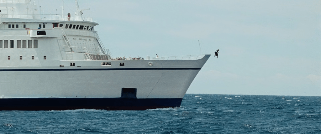 Deux autres films constatent en 2022 que le bateau de croisière est, au regard du changement climatique et de la pollution qu’il engendre, au mieux un colosse anecdotique, au pire une aberration. Le gratuitement provocant « Sans filtre » du surestimé Ruben Östlund dénonce sa décadence et la première image de « Les Crimes du futur » (David Cronenberg), – ci-dessus – son obsolescence, montrant un paquebot échoué près des côtes dans un futur délabré et incertain.