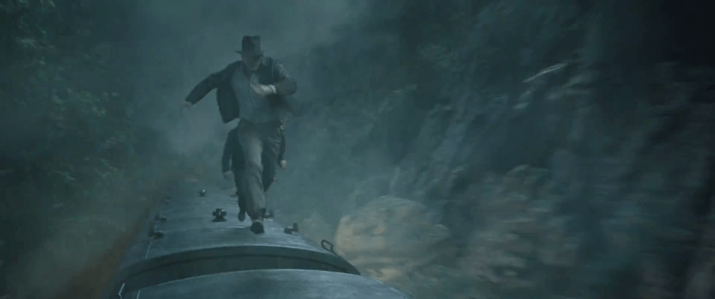 … avec une séquence surpassant les efforts récents des gros mastodontes hollywoodiens (Daniel Craig dans « Skyfall », 2012 ; Harrison Ford dans « Indiana Jones 5 », 2023 – ci-dessus ; Tom Cruise dans « Mission: Impossible 7.1 », 2023) qui envoient également leurs héros sur des toits en mouvement pour épater le spectateur, sans atteindre la légèreté et la maîtrise du réalisateur, aux moyens techniques pourtant beaucoup plus réduits !