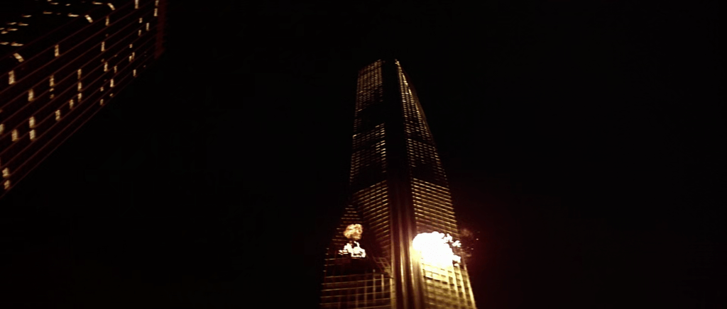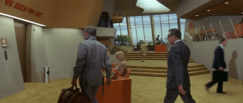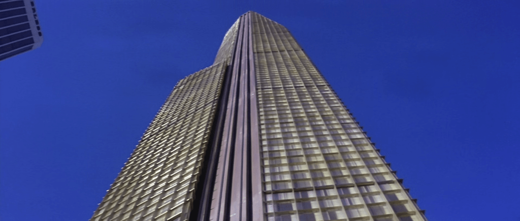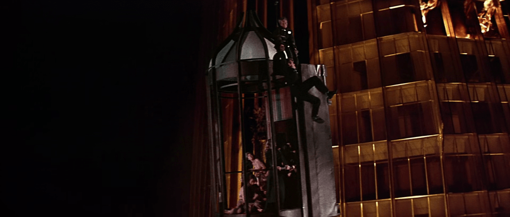 L’imposant ascenseur vitré extérieur s’inspire de l’ascenseur panoramique du Hyatt Regency Hôtel, construit un an avant le tournage à San Francisco par John Portmann. La séquence où l’ascenseur se détache de ses rails et risque de tomber dans le vide reste l’une des plus impressionnantes du film.