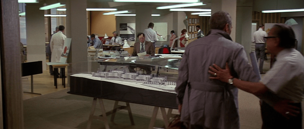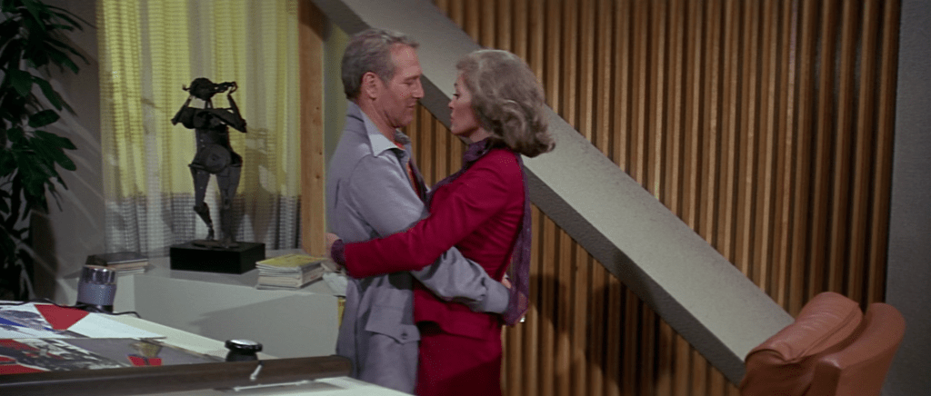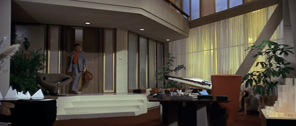 A l’autre bout de la pièce se trouve son bureau personnel très lumineux, qui s’étale sur deux niveaux ! La ravissante Susan Franklin (Faye Dunaway), sa petite amie, l’attend déjà pour l’embrasser.