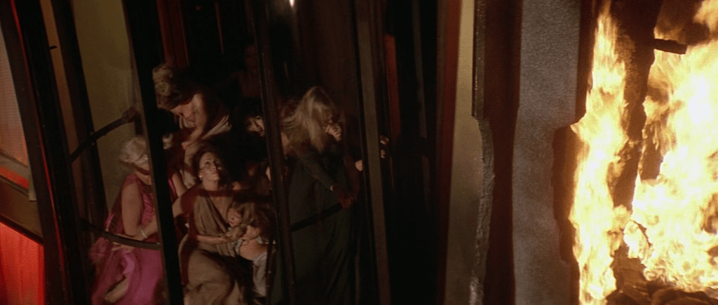 Le court-circuit provoque un feu qui se propage rapidement dans les étages inférieurs, pendant que la jet-set de San Francisco, insouciante, continue de fêter l’inauguration dans le restaurant situé à l’avant-dernier niveau.
