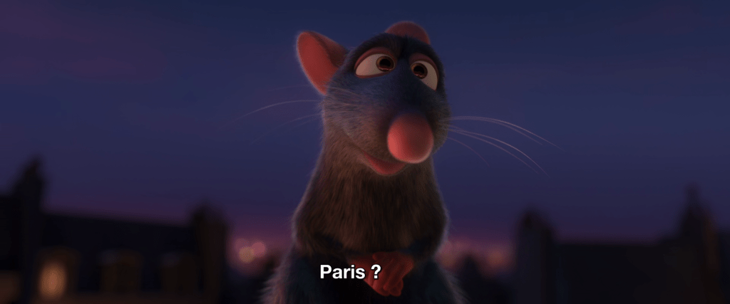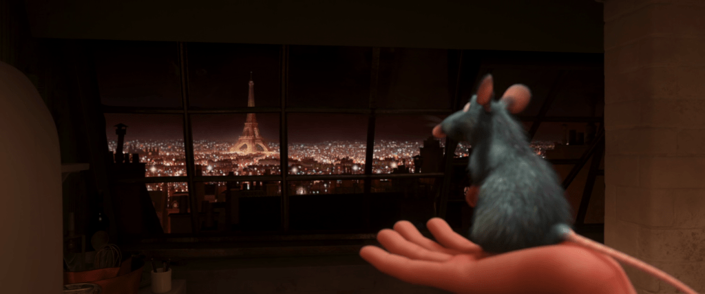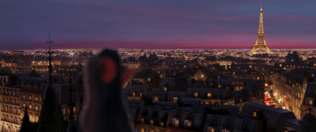 La tour, toujours plongée dans les nuances roses-rouges du soleil couchant devient ici métaphore de la réussite de Rémy le rat, devenu top chef à Paris (trois ans avant l’apparition d’Instagram, qui engendrera une multiplication exponentielle de ce genre d’images de rêve).
